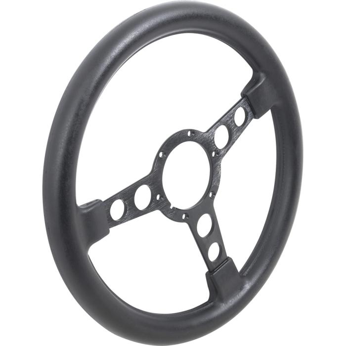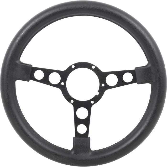Replacement steering wheel for 1969-76 Firebird Formula and 1970-72 GTO, Lemans and Tempest models. Steering wheel features original style three-spoke design, molded urethane soft grip and metal center. Measures 14' diameter with zero dish. This fat early style Trans Am wheel is beautiful right down to the grain and has an anodized black finish on the center spokes. The thickness of the wheel is nearly 4" around. If you took a tape measure and went all the way around the cushion, you will see that most reproduction or aftermarket wheels are only about 2" around the grip. The feel of this extra thick wheel is very comfortable in your hands.