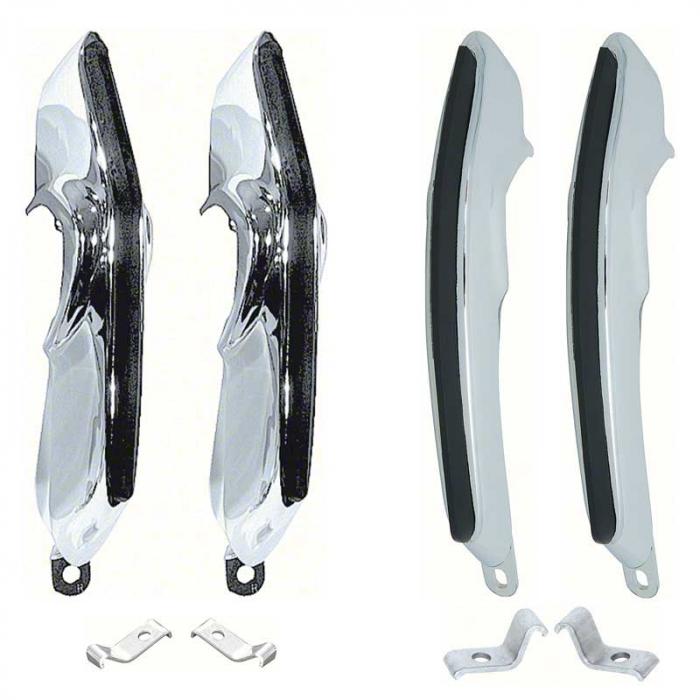 Reproduction of the original deluxe front and rear bumper guards designed for 1969 Camaro models. Manufactured to exact factory specifications assuring a quality appearance and fit. Features bright triple chrome plating. Sold as a set of 4 with 2 front bumper guards and 2 rear bumper guards with rubber inserts and brackets. Hardware is included with the front guards, hardware is not included with the rear guards.