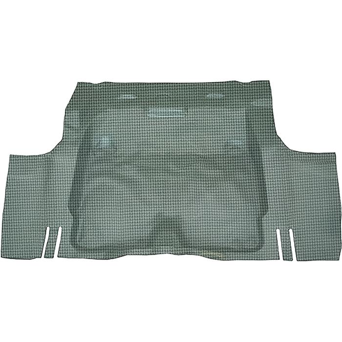 Authentic reproduction trunk mat is heat molded to fit the trunk pan then die-cut to the exact dimension of the original mat. The correct black/aqua Houndstooth pattern offers a completely original appearance. The mat is manufactured for coupe models( convertible models require minor trimming around the rear convertible weight dampeners).