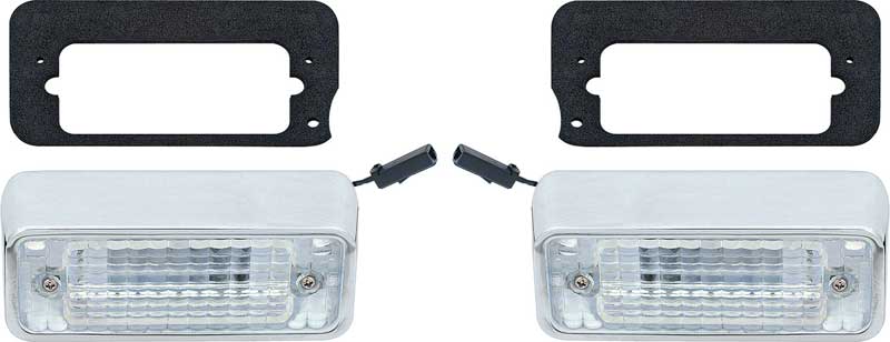 A complete assembly to replace the both passenger and drivers side back-up lamp assemblies on 1969 Camaro Rally Sport models. Includes correct chrome housings, housing to body gaskest, lenes, lens gaskets, bulbs, sockest with 8" lead wire and the orig inal type molded rubber boot.