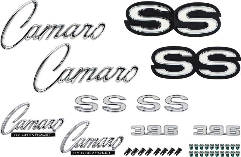 Complete exterior emblem kit designed to replace the fender, grill, rear panel, header panel, and trunk lid emblems for 1969 Camaro Super Sport models without the RS option (hidden headlamps). Each emblem is manufactured to replicate the original in quailty and fitment. Emblems are manufactured in die-cast zinc material and include proper polishing and paint when required. Each kit includes the correct body emblems with proper engine size and lettering. Emblem kits include correct bracket and barrel nuts for installation when required.
