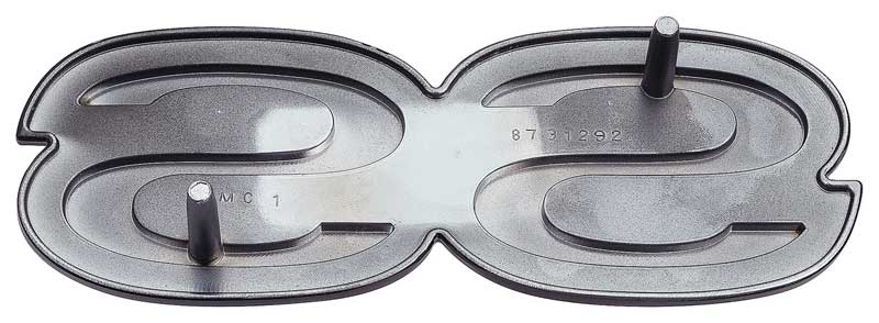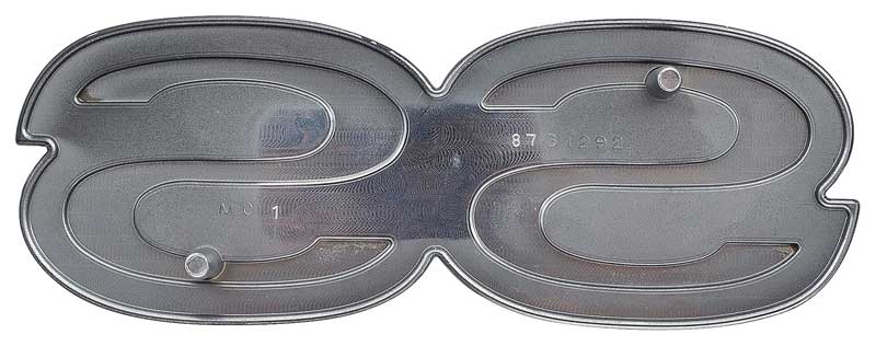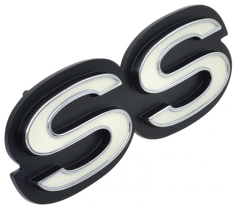 Reproduction of the original "SS" rear panel emblem designed for use with 1969 Camaro SS-350 and SS-396 models. Each emblem is manufactured in quality die-cast zinc featuring a black and egg shell white paint scheme matching the original in appearance and design. Installs onto the rear panel between the tail lamps. Includes mounting hardware