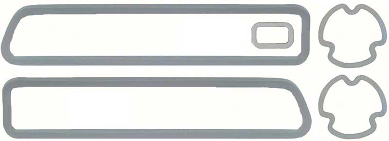 Reproduction of the original exterior lens gaskets designed to replace the old or worn out originals on 1969 standard Camaros. This replacement gasket set includes both rear tail light lens to housing gaskets, the rear license lamp gasket and the front park lamp gaskets. Recommended when replacing your lenses. Made in the USA!