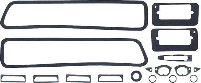 A complete set of reproduction exterior gaskets designed for use on 1969 standard or RS Camaro models. Each set is designed to replace the gaskets for the door handles, tail lights, back-up lights, side markers, mirror gasket, antenna base, door lock cylinders and trunk lock gasket. This highly recommended replacement set will prevent dust and moisture from entering crucial areas where paint can chip and crack.