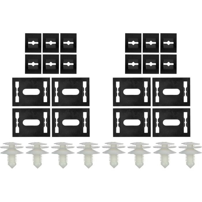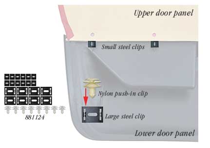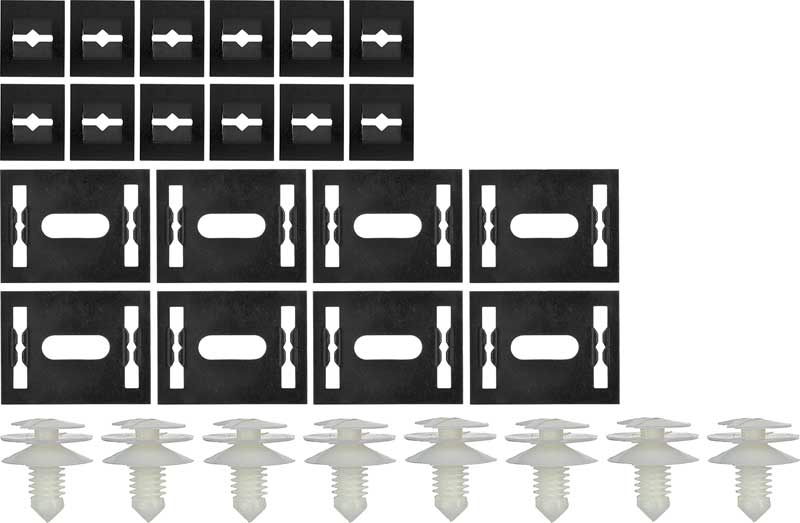 Complete inner lower door panel clip set designed to install both RH and LH panels. This 28 piece set includes 3 seperate style clips designed to replicate the original GM design. Includes 12 (6 per door) small metal clips that attach the upper door pa nel to the inner lower door panel, 8 (4 per door) large metal clips that attach to the lower door panel and hold the 8 (4 per door) plastic push-in clips.