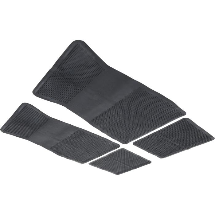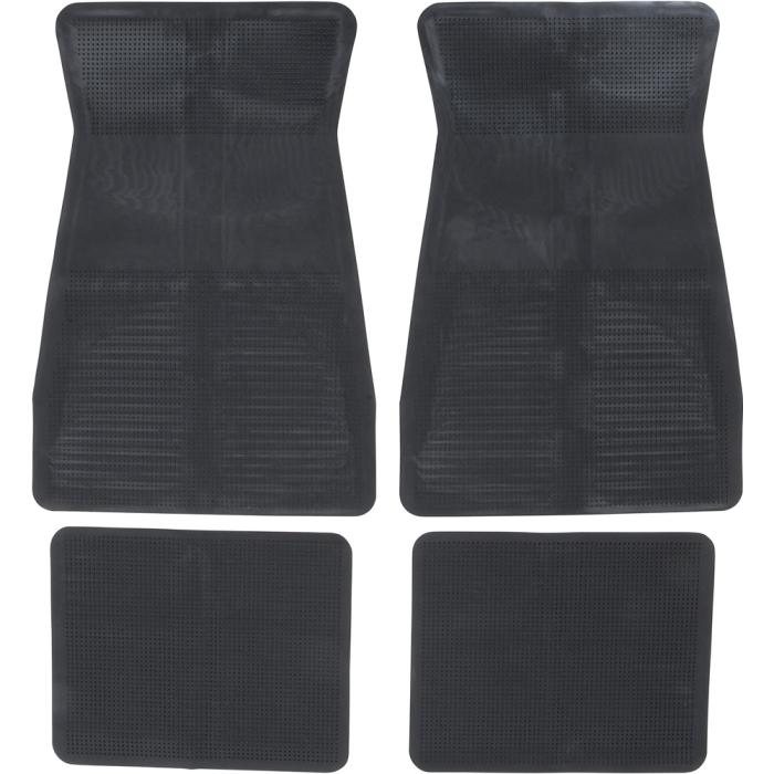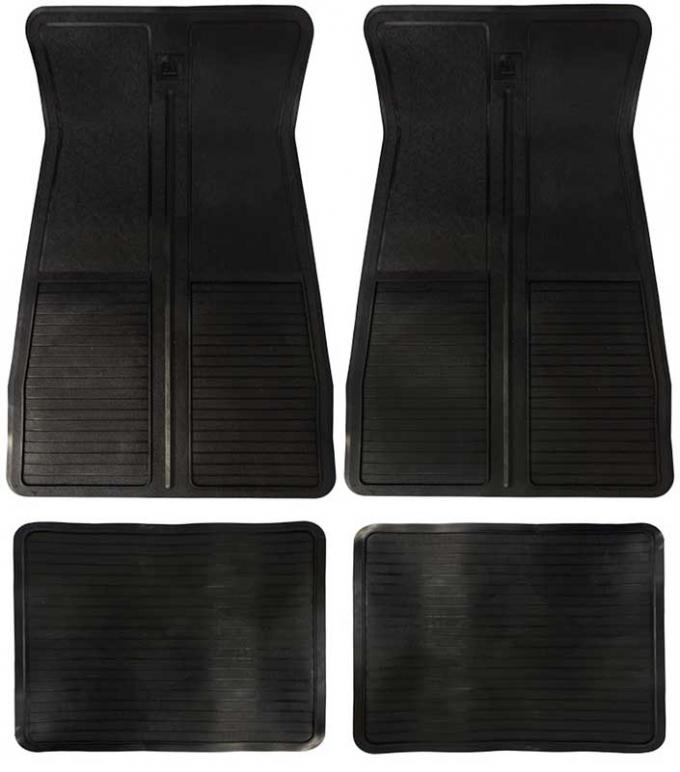 Reproduction of the original style rubber floor mats designed for use with various 1973-93 models including Camaro, Firebird, Impala, Bel Air, Biscayne, Nova, and other GM models. Manufactured from automotive grade rubber to factory specifications and die-cut to fit the original contour of the floor pan. Features a GM logo on the front mats, the correct textures, color and anti-slip carpet grippers on the bottom. Sold as a 4 piece set with 2 front and 2 rear mats.