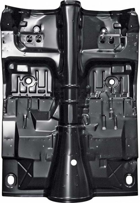 Reproduction of the original floor pan assembly designed for use with 1975-1981 Camaro and Firebird models equipped with an automatic transmission. This complete floor pan is manufactured in stamped steel to OE factory specifications, accurately replicating the original design and fitment. Features factory-style contours, pre-punched drain holes, correct stiffening ribs, and all underside bracing for strength and authenticity. Finished in black EDP coating for rust and corrosion prevention.