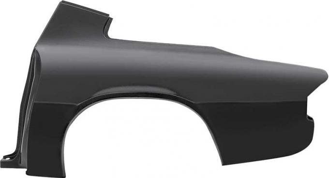 Reproduction full quarter panel for 1975-81 Camaro models with rear spoiler. Each quarter panel is manufactured in quality stamped steel and matches the original in both quality and fitment. Not just a replacement skin, this panel replaces the entire quarter panel section including the door jamb, trunk gutter, partial upper sail panel, and more. Designed to attach at the original factory seams for a clean, precise installation. Ready to be prepped, primed, and painted without stripping.