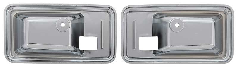 OER reproduction of the original door handle escutcheons designed for use on various 1975-82 GM models. Manufactured from quality injection molded ABS featuring bright chrome plated trim and black detailed accent. Door handle escutcheons are installed on the door panel behind the door release handle. Sold in pairs.