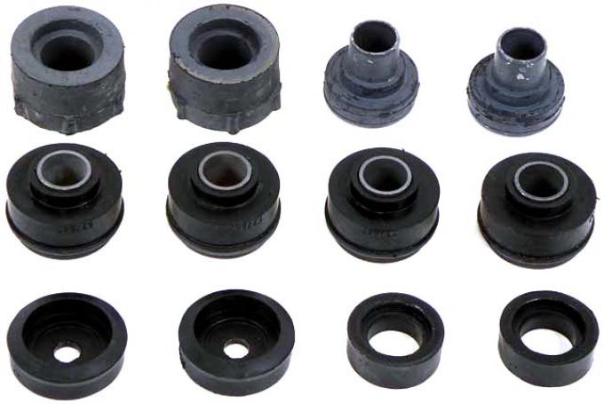 Reproduction body mount and radiator support bushings for 1976 Pontiac Firebird and Trans Am models. Replacing the original body mount bushings with OER® rubber reproductions is a sure fire way of maintaining originality and mounting the subframe exactly the way the factory intended. Each set of bushings contains all shouldered rubber bushings and cushions required for complete replacement of the subframe. Each body mount is produced using correct compression molded S.B.R. with steel sleeve inserts where required.