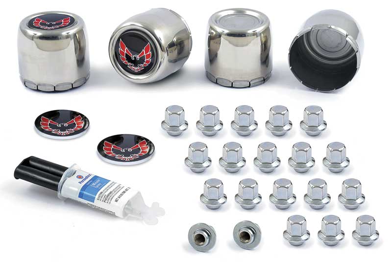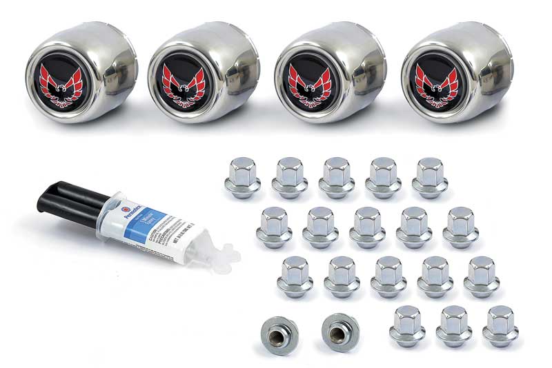 Reproduction stainless steel wheel center cap, emblem and lug nut kit for 1977-81 Pontiac Firebird models with snowflake wheels. This kit includes 4 stainless steel caps, 4 red Firebird emblems, 20 factory style 7/16"-20 lug nuts, and 1 tube of epoxy cement to adhere the emblems to the caps.