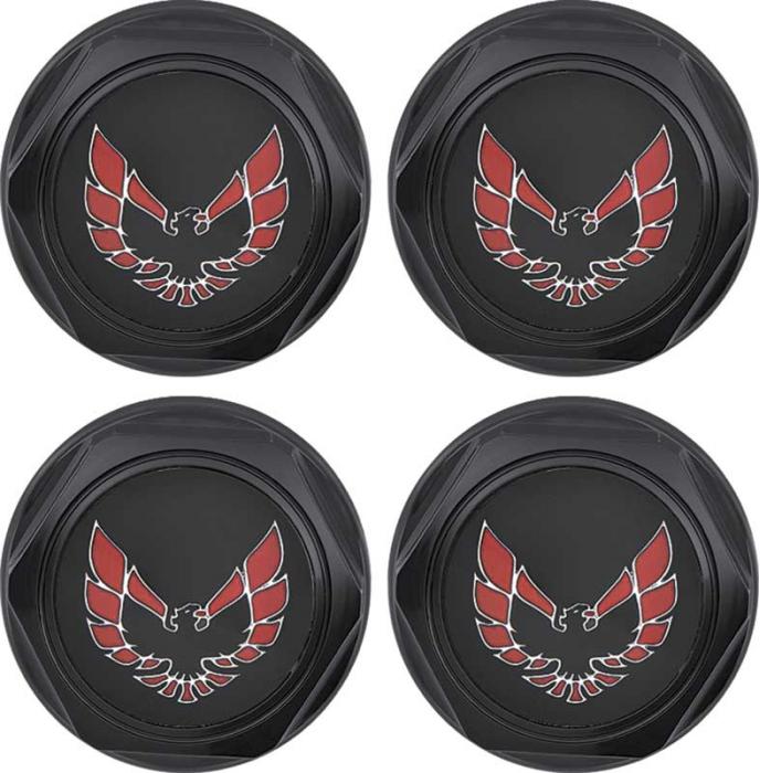 Reproduction of the wheel center cap and emblem set for 1977-81 Pontiac Firebird models. This set of 4 flat black caps has early red bird emblems without the metal retaining clips.