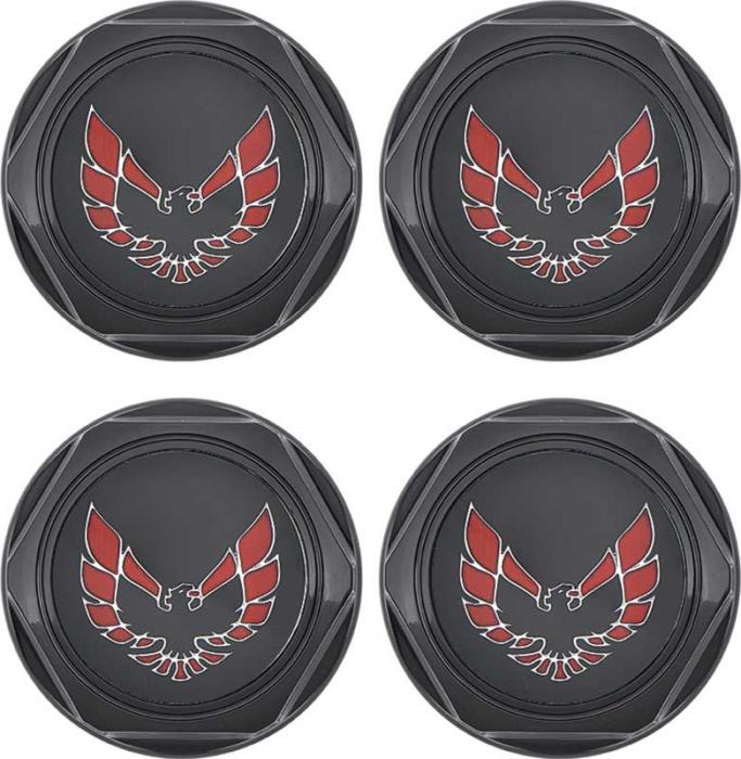 Reproduction of the wheel center cap and emblem set for 1977-81 Pontiac Firebird models. This set of 4 gloss black caps has early red bird emblems and the metal retaining clips attached.