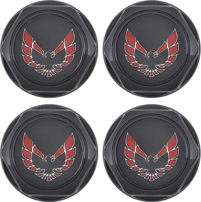 Reproduction of the wheel center cap and emblem set for 1977-81 Pontiac Firebird models. This set of 4 gloss black caps has early red bird emblems without the metal retaining clips attached.