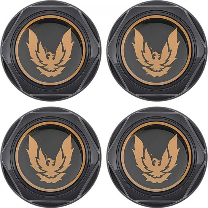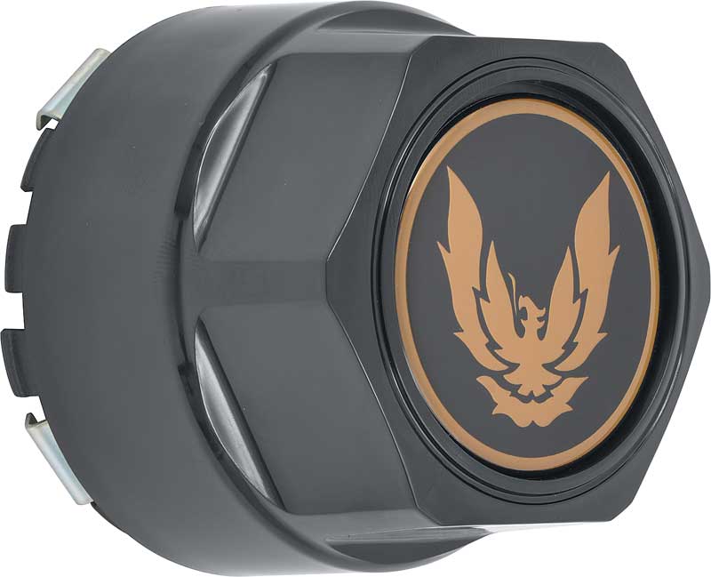 Reproduction of the original wheel center caps designed for use with 1982-92 Pontiac Firebird Trans Am models as listed. This set of gloss black hub caps features the correct Gold Firebird logo. Includes correct metal retaining clip attached. Set of 4 hub caps.