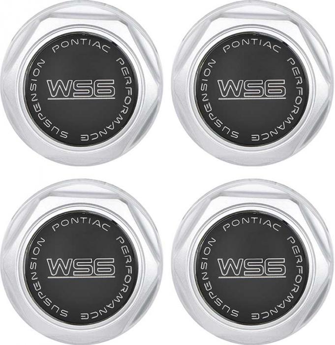 Reproduction wheel center hub cap for 1982-92 Pontiac Firebird Trans Am and Fotmula models with the WS6 performance package. This silver plastic cap has the metal clip attached and features a black center with the "WS6 Performance Suspension" logo. Can be used on 1982-92 models. Sold as a set of 4.