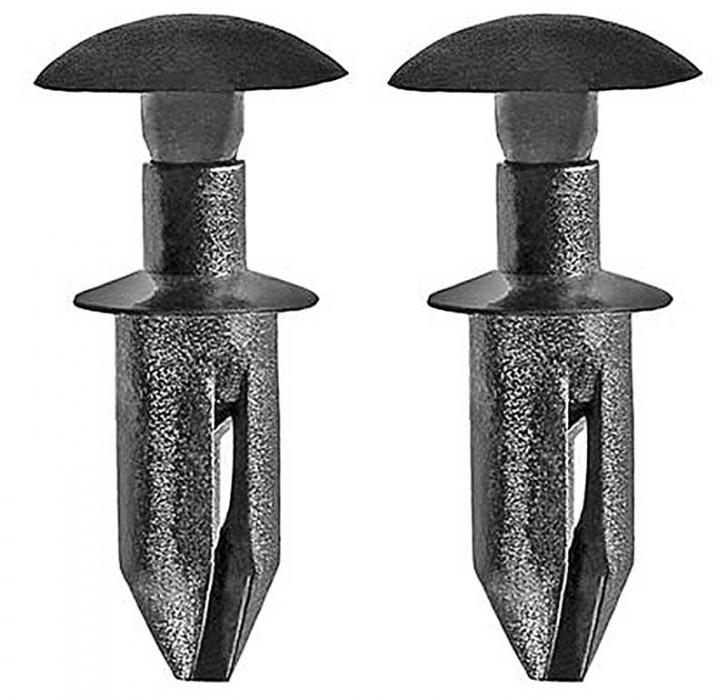Reproduction domed head (rivet style) body molding push-pin retainer. Manufactured in high-impact black nylon material, each push pin is designed to fit into a 3/16"- 7/32" hole. Pushing on the 3/8" domed head will spread the tabs on the 7/16" shaft, to secure the tail lamps, moldings, or other trim part into place. Sold in pairs. Use as required.