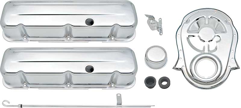 Dress up your Chevrolet Big Block engine in brilliant show quality polished chrome with this engine dress up set. Includes the basic components needed to make your engines appearance shine! Features tall profile valve covers. Will fit Chevrolet 396, 427, 454 big block engines.
