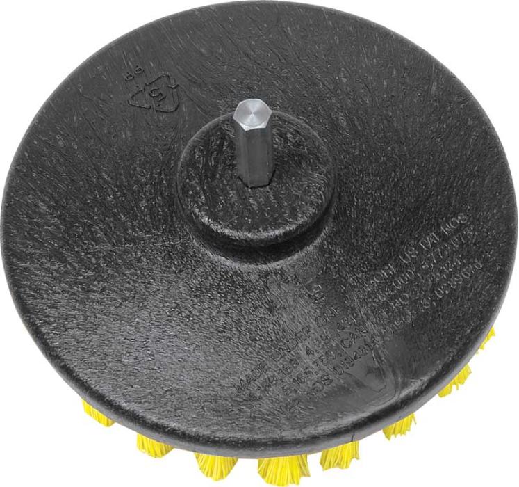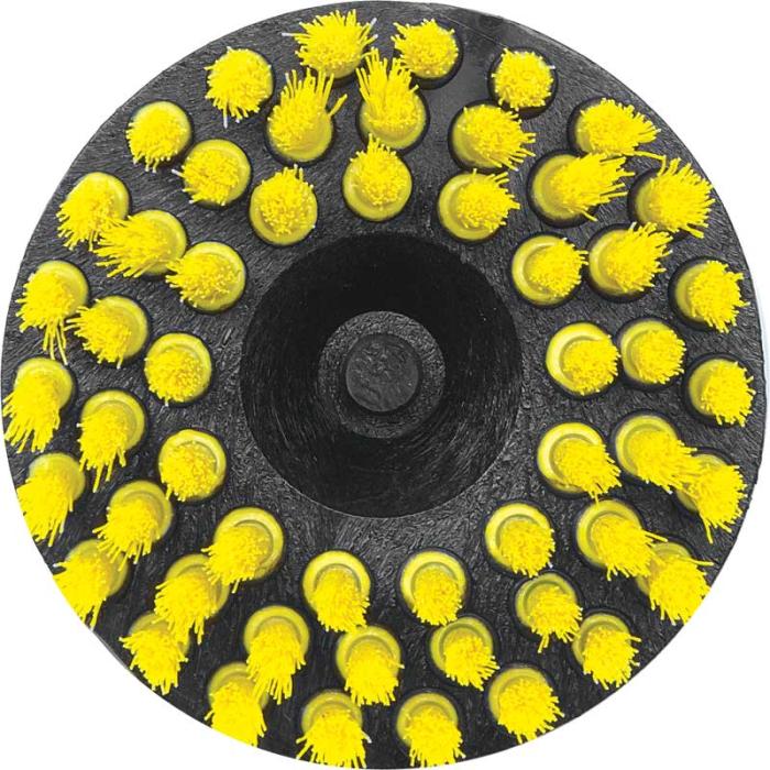 Use the drill brush with any drill. The yellow brush has soft bristles and can be used to clean carpet, upholstery, fabrics, door panels, wheels and more.