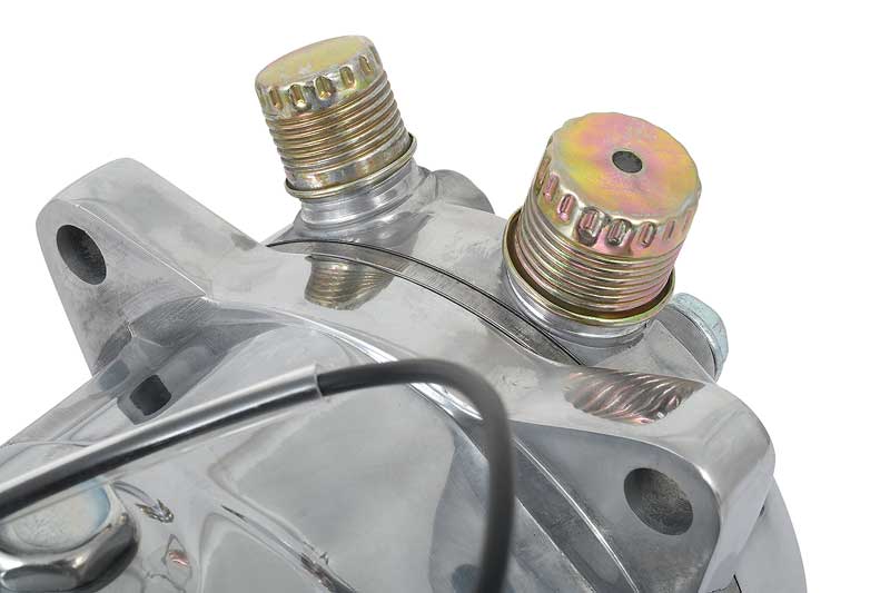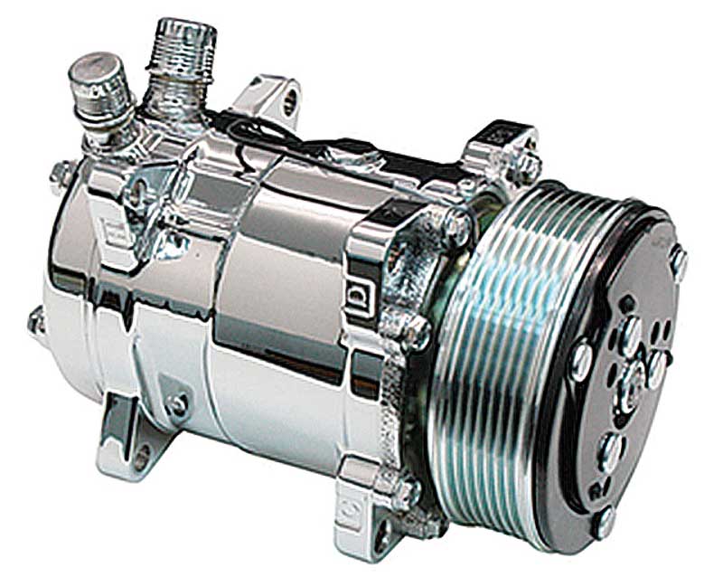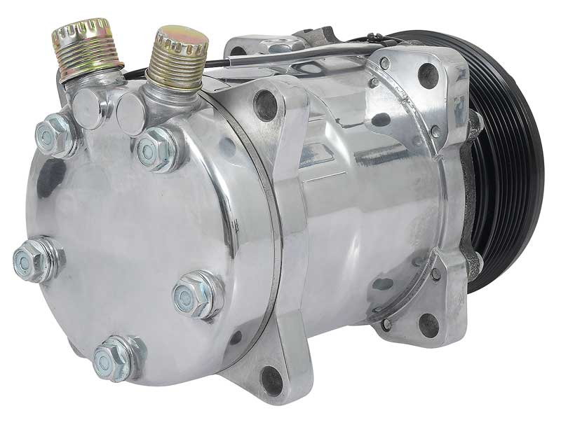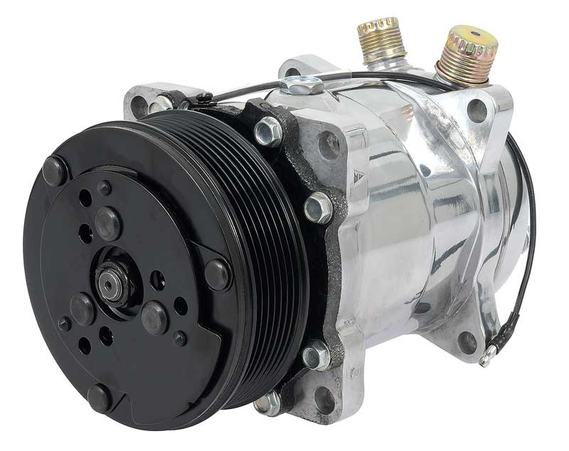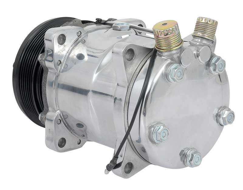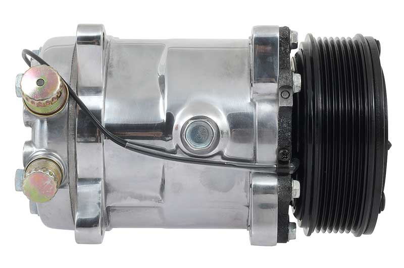 This compressor features a polished finish, a 7-rib serpentine clutch, and vertical top inlet/outlet O-ring ports. Can be used with either R-12 or R-134a.