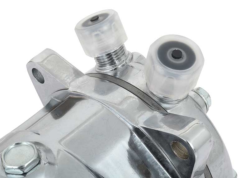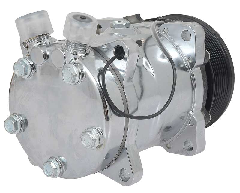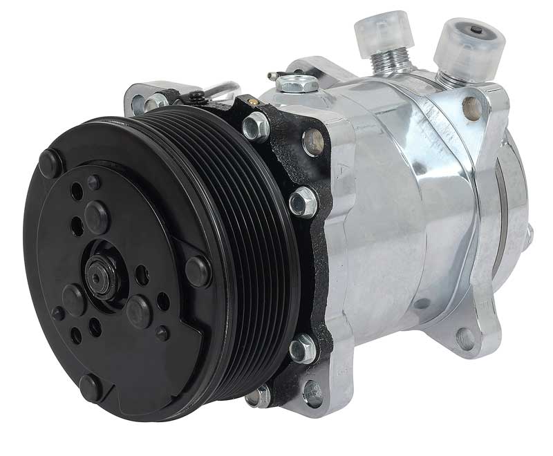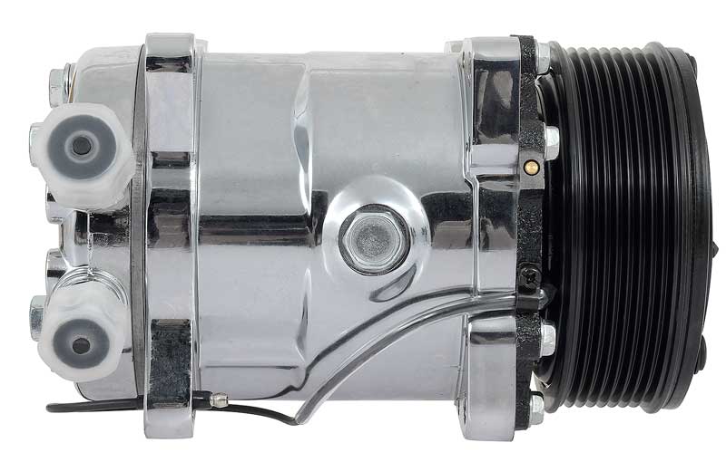 This compressor features a chrome finish, a 8-rib serpentine clutch, and vertical top inlet/outlet O-ring ports. Can be used with either R-12 or R-134a.