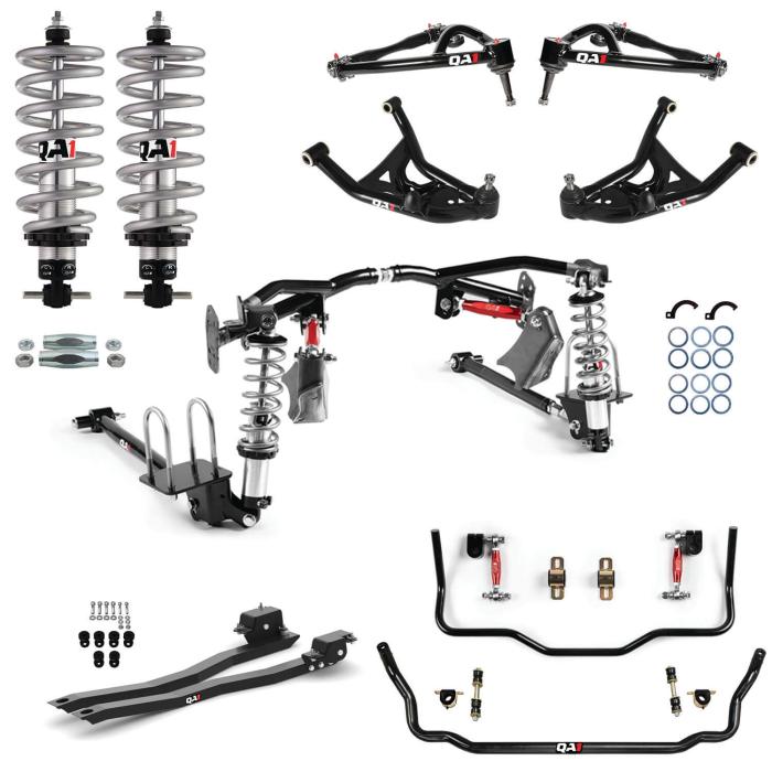 QA1's tubular front control arms stand out as some of the lightest available in the market. Low friction polyurethane bushings reduce flex and deliver bind-free movement. When paired with QA1's double adjustable Pro-Coil coilovers, and front sway bar this kit offers plenty of control over your suspension.