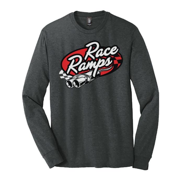 Show your Race Ramps pride with this 2XL-sized comfortable long-sleeve crew neck T-shirt! The blended fabric features a rib-knit neck and cuffs, and comes in Black Frost with the Race Ramps tailpipe logo on the front.