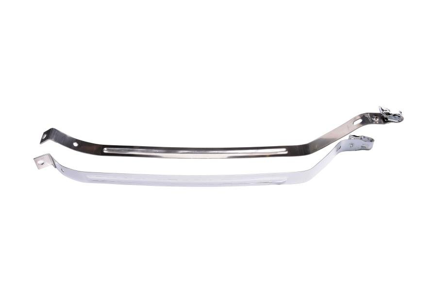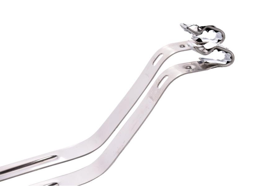 Instructions: Safely support the vehicle’s rear and secure the fuel tank with a jack or stand. Remove the existing straps and mounting hardware. Fit the new stainless steel straps over the tank and align with the factory mounting points. Secure using correct hardware and confirm the tank is properly supported before lowering the vehicle.