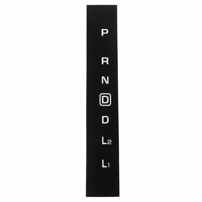Indicator lens adapter for a factory console with display for 4-speed overdrive automatic transmissions. This is a black decal that goes over-top of your current indicator and the letters are translucent white so light will still show through.