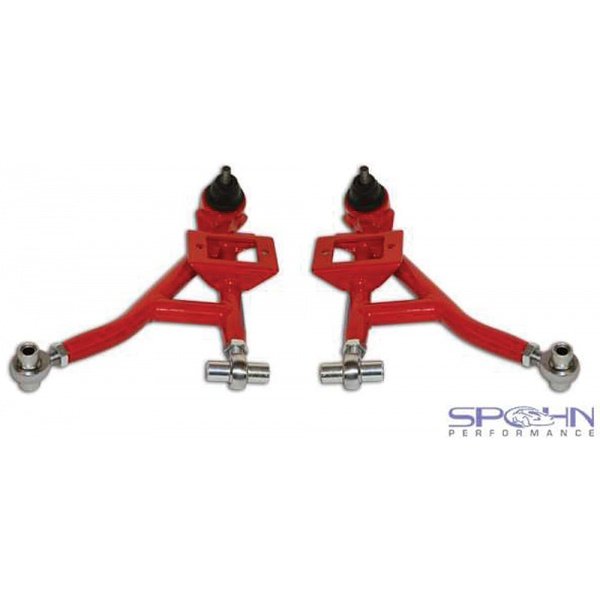 Ball Joint Cups Are CNC Machined From 2.75 O.D. x .375 Wall Seamless Mechanical Tubing 3/4 Chrome Moly Spherical Rod Ends With Teflon? Self-Lubricating Race Rod Ends Allow Additional Alignment Adjustability TIG Welded 4130 Chrome Moly Threaded Tube Adapters CNC Machined Through Sleeve & Zinc Coated Steel Spacers Keep Rod Ends Perfectly Centered Spohn Performance's front lower a-arms set a new, higher standard of performance and quality. When we designed our a-arms, we had two goals in mind. One was to provide the performance capabilities needed for the toughest race tracks, the second was to provide the strength and durability required for the demands of a daily driven vehicle. We're proud to say that we have accomplished both. Spohn's front lower a-arms are a true A arm rather than a V arm. This provides maximum rigidity and equalizes forces delivered in to the k-member. Spohn control arms are gusseted in critical areas to ensure that a weld never breaks. The Spohn front control arms can be installed on a stock k-member, or on aftermarket k-members. They decrease overall weight, and more importantly - unsprung weight. If you are looking for the highest quality front suspension components for the fourth generation F-Body, you just found them!