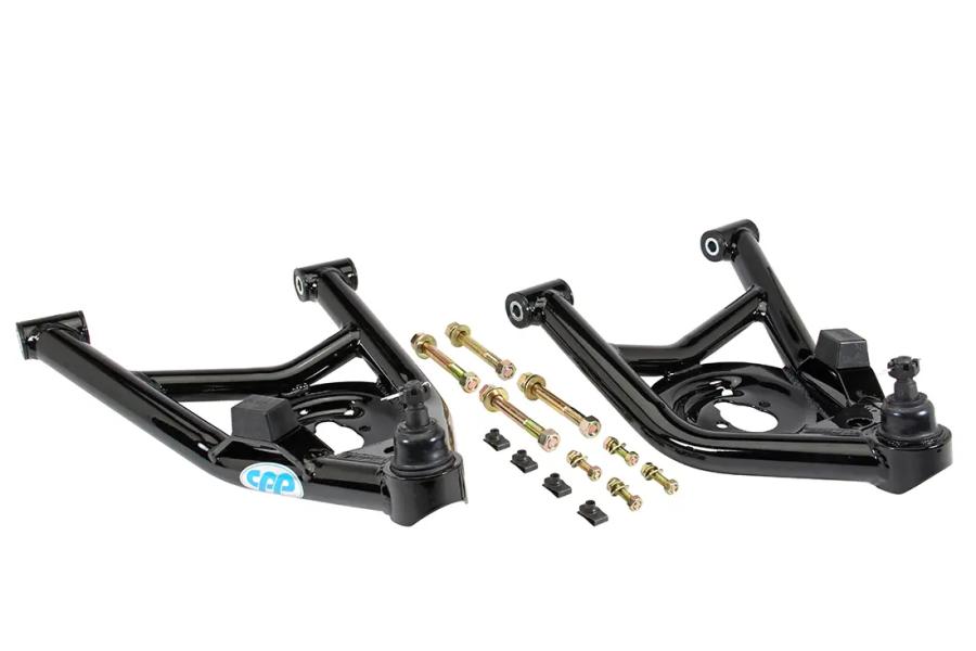 The CPP Totally Tubular Lower Control Arms (Part Number 6774TCA-LKB) fit 1967-1969 Chevy Camaro and 1968-1974 Chevy Nova. They include ball joints and D Spec bushings. Designed for durability and precision.