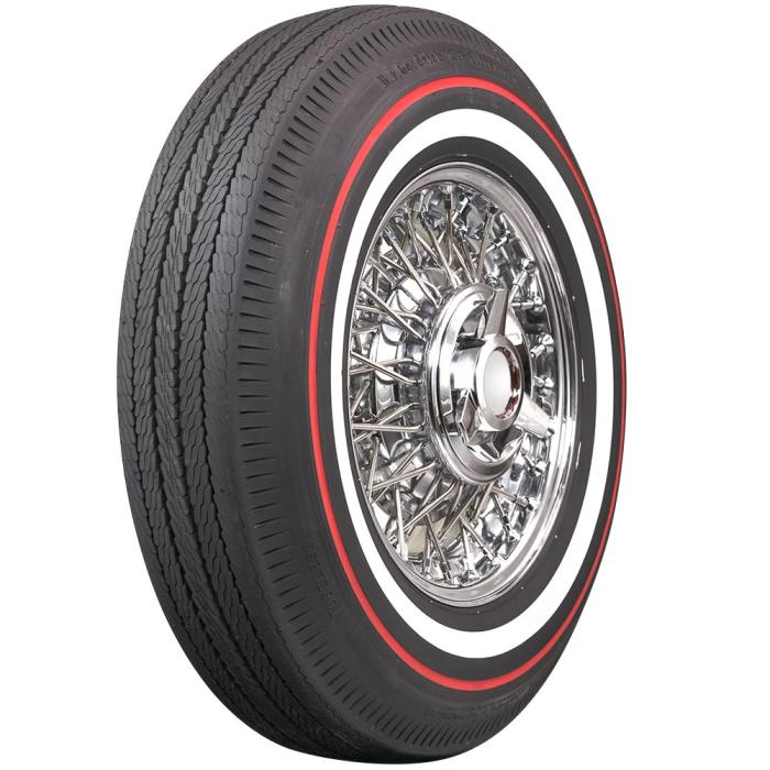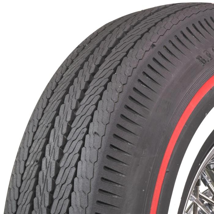 This product features a genuine redline sidewall style, sometimes known as a red stripe, due to the thin 3/8-inch strip rubber. This means that the red rubber is added directly to the tire sidewall during initial construction of the carcass, resulting in a truly integrated, high-quality product after vulcanization. Redline tires hit the American automobile market in 1964 with the introduction of the Pontiac GTO and remained a popular muscle car tire until around 1970. Dual redline tires (two red stripes) were an option on Ford Mustangs, and are now reproduced in original bias ply construction as well as radial construction.