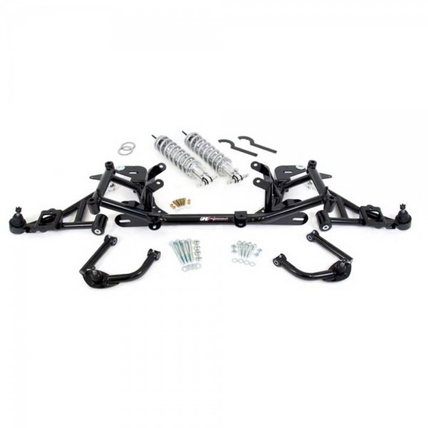 It features the best of both worlds with performance, weight reduction, strength and comfort. Our dual tube k-member is known as the strongest in its class and can withstand wheel stand landings and street abuse while still shaving weight as well as protecting the oil pan. The lower arms feature poly bushings on the straight strut portion to absorb road noise while the non-adjustable uppers guide the suspension on greaseable poly bushings. UMI's k-member and a-arms are built from strong USA DOM tubing, precision bent, CNC notched and welded in a jig to form a solid base. Upper and lower a-arms are assembled with high quality polyurethane bushings and premium ball joints. Included in the kit are Viking front coilovers with double adjustable shocks that allow ride height, compression and rebound adjustment. The ride height adjustment is accomplished with the included spanner wrenches and thrust washers. The compression and rebound adjusters are clicked by hand (no tools!) and feature a total of 361 possible valving combinations. The included springs are 550lb/in and work excellent on daily driven and corner carving applications. Designed for LS1equipped Firebird and Trans Am 1998, 1999, 2000, 2001, 2002