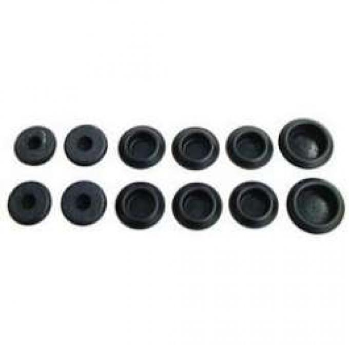 Rubber and plastic body plugs for floors, trunk extensions and rear outer wheel wells. Set of 12.