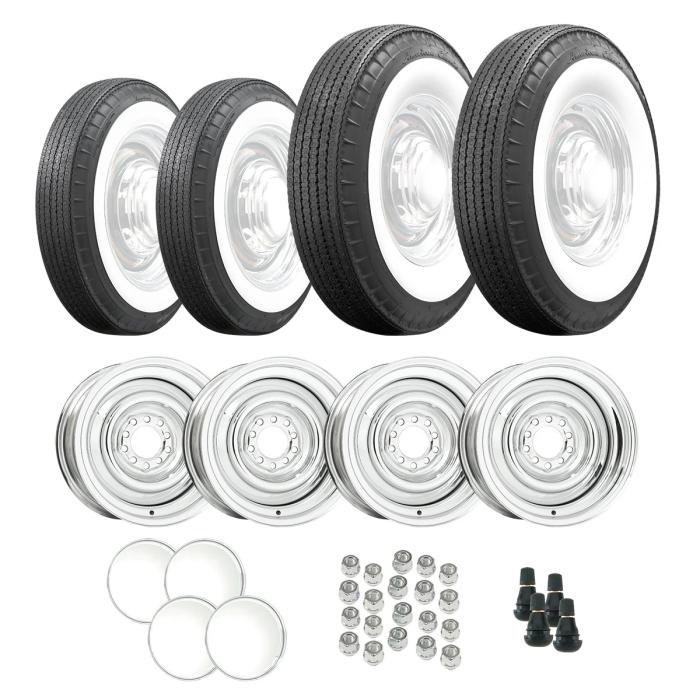 Get the perfect hot rod stance with our American Classic bias look radial combo. With a big-and-little size combo, you’re looking at 560R15 front runners and 820R15 out back. The tires feature authentic wide whitewalls, a bias ply look and the smooth ride of a modern radial. The tires are shipped to your door mounted to a set of chrome Smoothie wheels, sized at 15x5 and 15x7 for a great staggered fitment. This combination works well on an old school hot rod, rat rod or gasser, and it comes complete with Baby Moon caps, rubber valve stems and open-end lug nuts. All of this is based around a small Ford, 5x4.5-inch and small GM 5x4.75 inch bolt pattern. Skip the hassle of the local tire shop and jump right into installing this package on your car. We mount and balance the setup FREE of charge, and the best part is that classic tire and wheel professionals handle the process with great attention to detail, ensuring your car rides smooth and looks great.