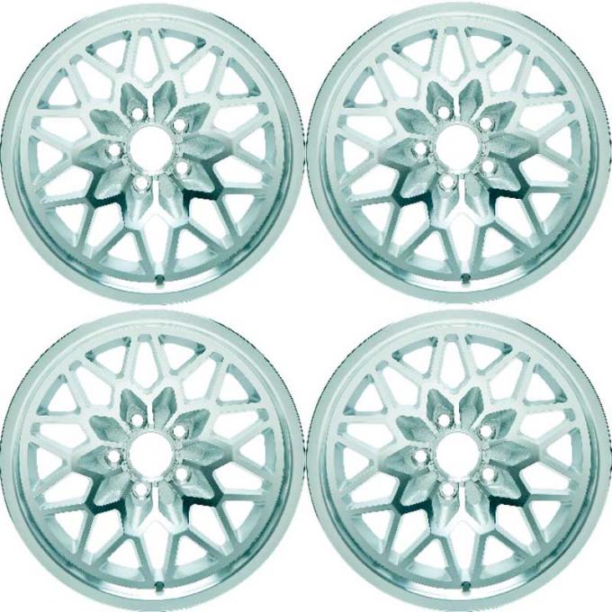 Reproduction of the original cast aluminum "Snowflake" wheels designed for use with 1978-81 Pontiac Firebird and Trans Am models. This wheel set was originally part of the WS6 option package on 1978-81 Trans Am models. Each set has silver painted inserts and is finished with a clear coat as original. Features 4-1/4" backspacing and 5 x 4-3/4" bolt pattern. Wheel weight is 24 lbs.