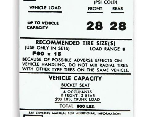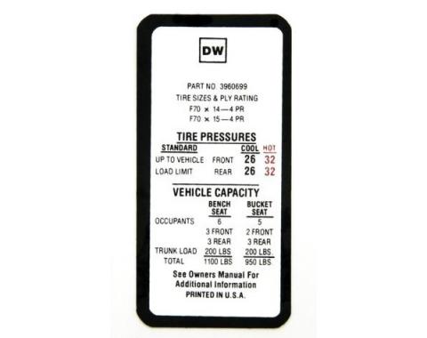 Reproduction Of Original This Camaro reproduction tire pressure decal has been manufactured to original factory specifications using today's modern manufacturing techniques. You will find the fit, finish and function will work superbly for…