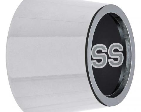 This die cast zinc hubcap features the 'SS' logo originally found on the 69-70 GM A-Bodies with a black backround and chrome bezel. Made to fit legendary wheels.