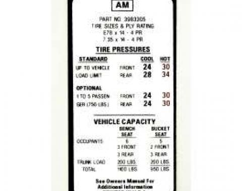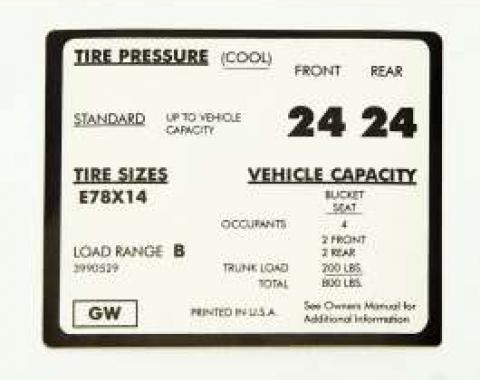 Reproduction Of Original This Camaro reproduction tire pressure decal has been manufactured to original factory specifications using today's modern manufacturing techniques. You will find the fit, finish and function will work superbly for…